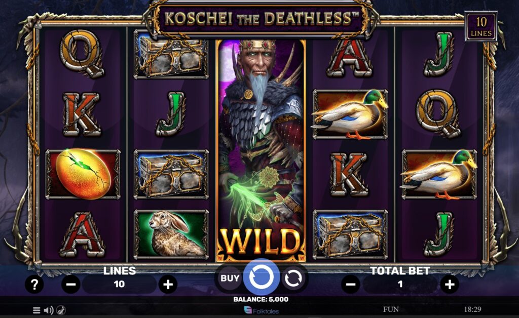 Players are tasked with travelling through an enchanted murky forest at the end of the earth where glory awaits for only those brave enough to withstand Koschei The Deathless. Powerful magic and a wicked intellect are just some of the ways in which he will guard his secrets and maintain his immortality. An atmospheric audio backdrop enhances the anticipation on the reels. Medium symbols on the reels include a golden egg, duck, rabbit and locked treasure chest.